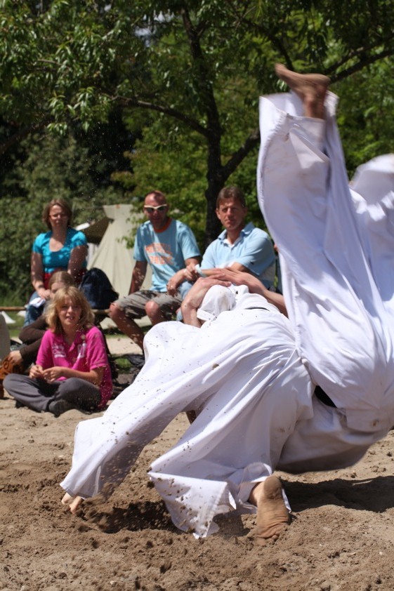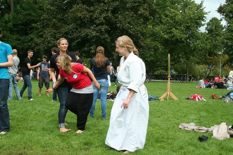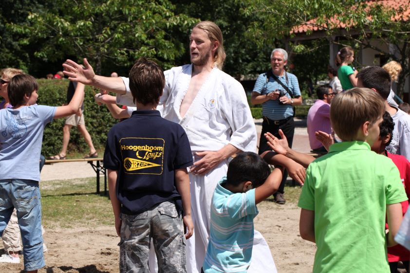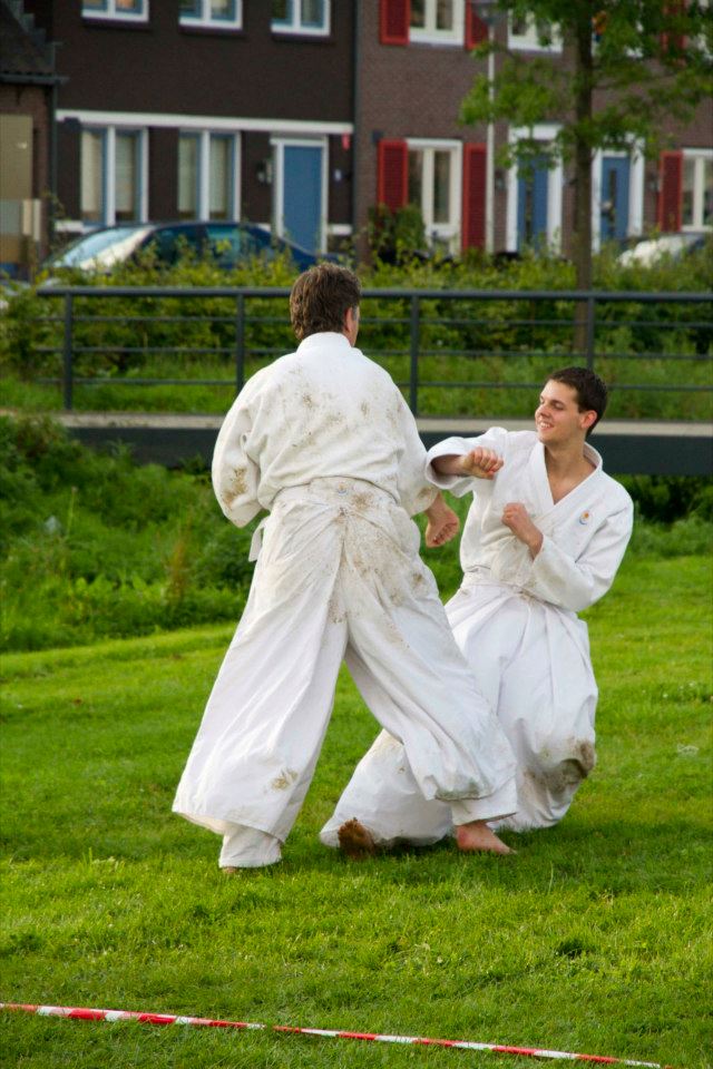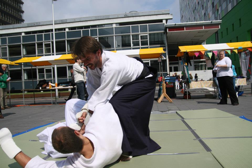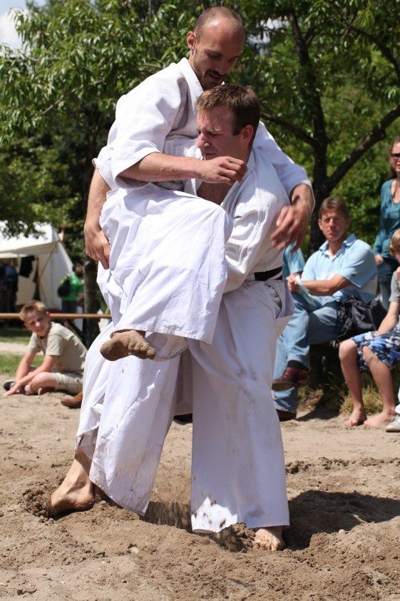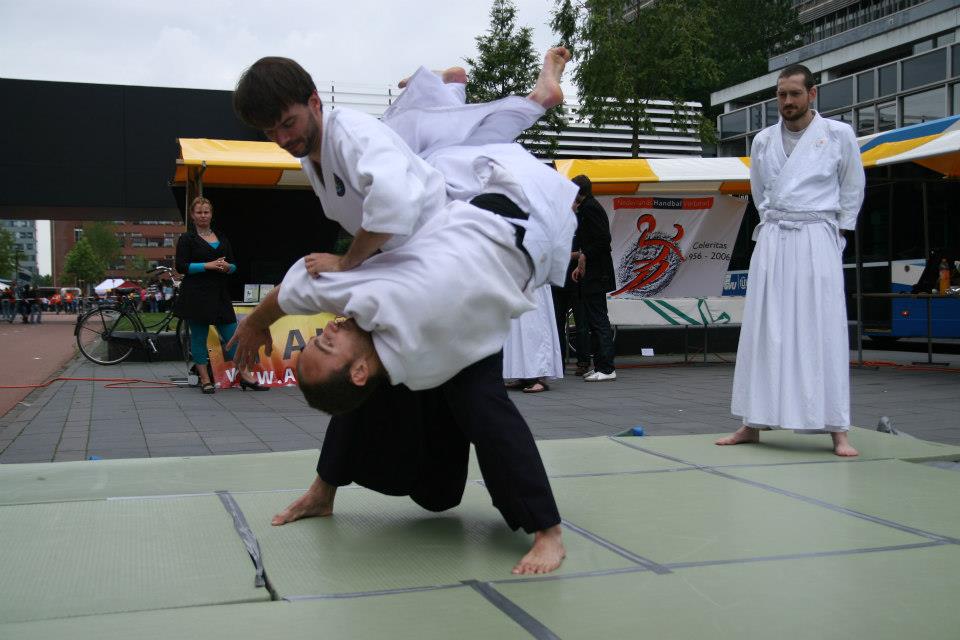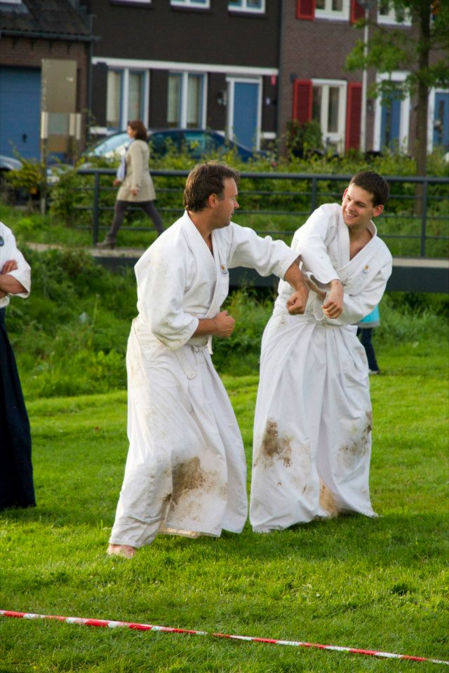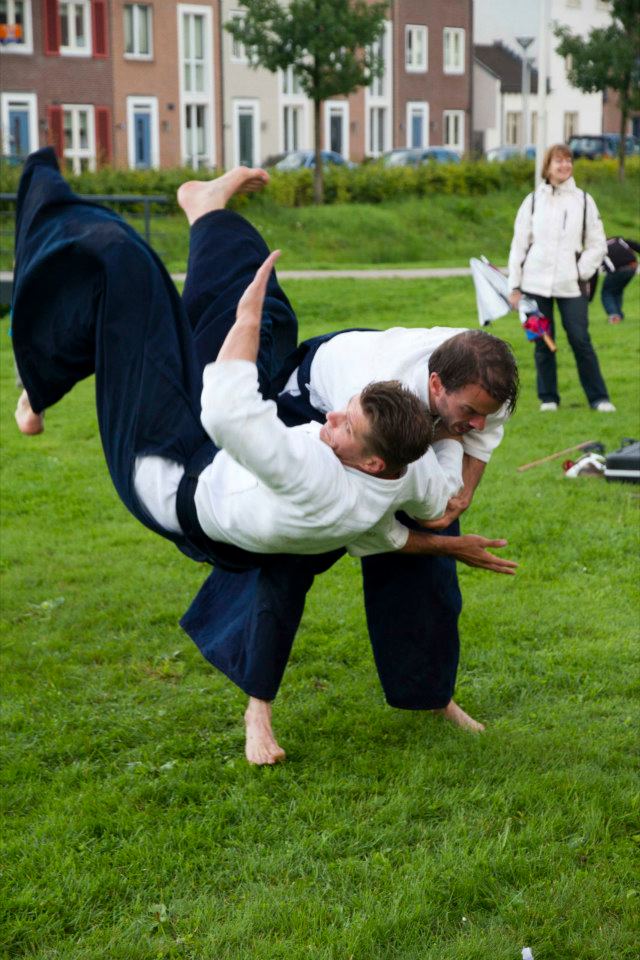 - Jeroen Verhoef past een Sutemi Waza (opofferingsworp) toe op Wouter Doorn tijdens een demonstratie in het Archeon, Juni 2011
