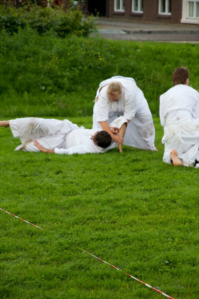 - Jeroen Verhoef past een Sutemi Waza toe op Wouter Doorn, tijdens een demonstratie in het Archeon, Juni 2011