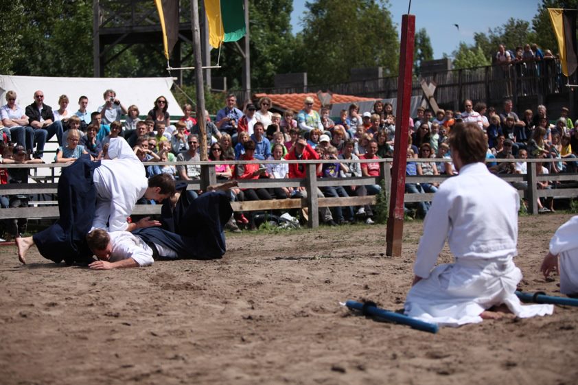 - Jeroen Verhoef voert een Sutemi Waza (opofferingstechniek) uit met Wouter Doorn, tijdens een demonstratie in het Archeon, Juni 2011
