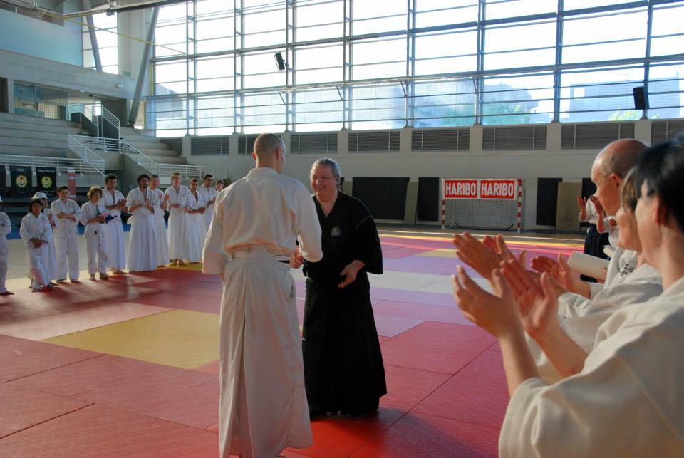 - Mike-san ontvangt uit handen van Oswalda-Sensei zijn Dan-certificaat
